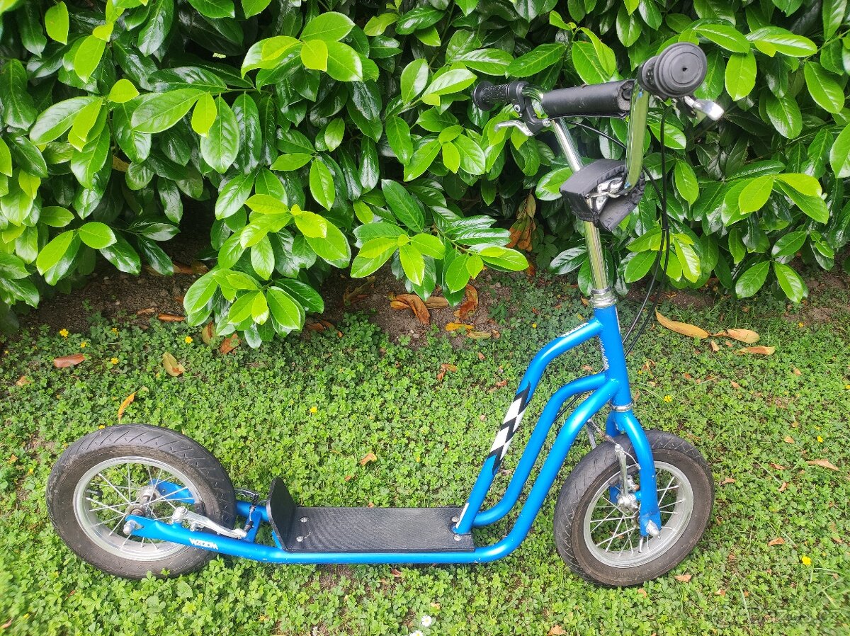 Tmavě modrá koloběžka typ WZOOM pro děti od 6 let, po jednom dítěti, běžné opotřebení - viz.foto, jinak v perfektním stavu, plně funkční. Nafukovací kola, protiskluzové stupátko, brzda. Lehká, snadno ovladatelná. Cena nové koloběžky 4990 Kč. Pouze osobní převzetí v Praze.