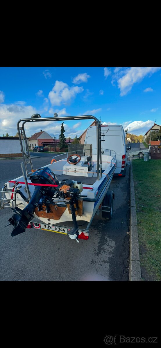 Prodám nejen rybářskou loď Open 430 se 3 motory . Držáky na pruty atd., kožené podsedaky -nejsou na foto. Cena včetně přepravního vozíku s STK !! A v ceně je i echolot Lowrance !