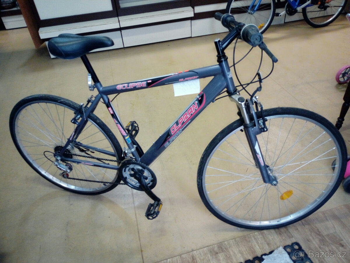 Prodám levně nové trekové kolo Olpran Eclipse. pevný, ocelový rám 19", kola 28", odpružená přední vidlice, přehazovačka Shimano TZ 31, trojtalíř Shimano TY 18, počet rychlosti 18, kotoučové brzdy.