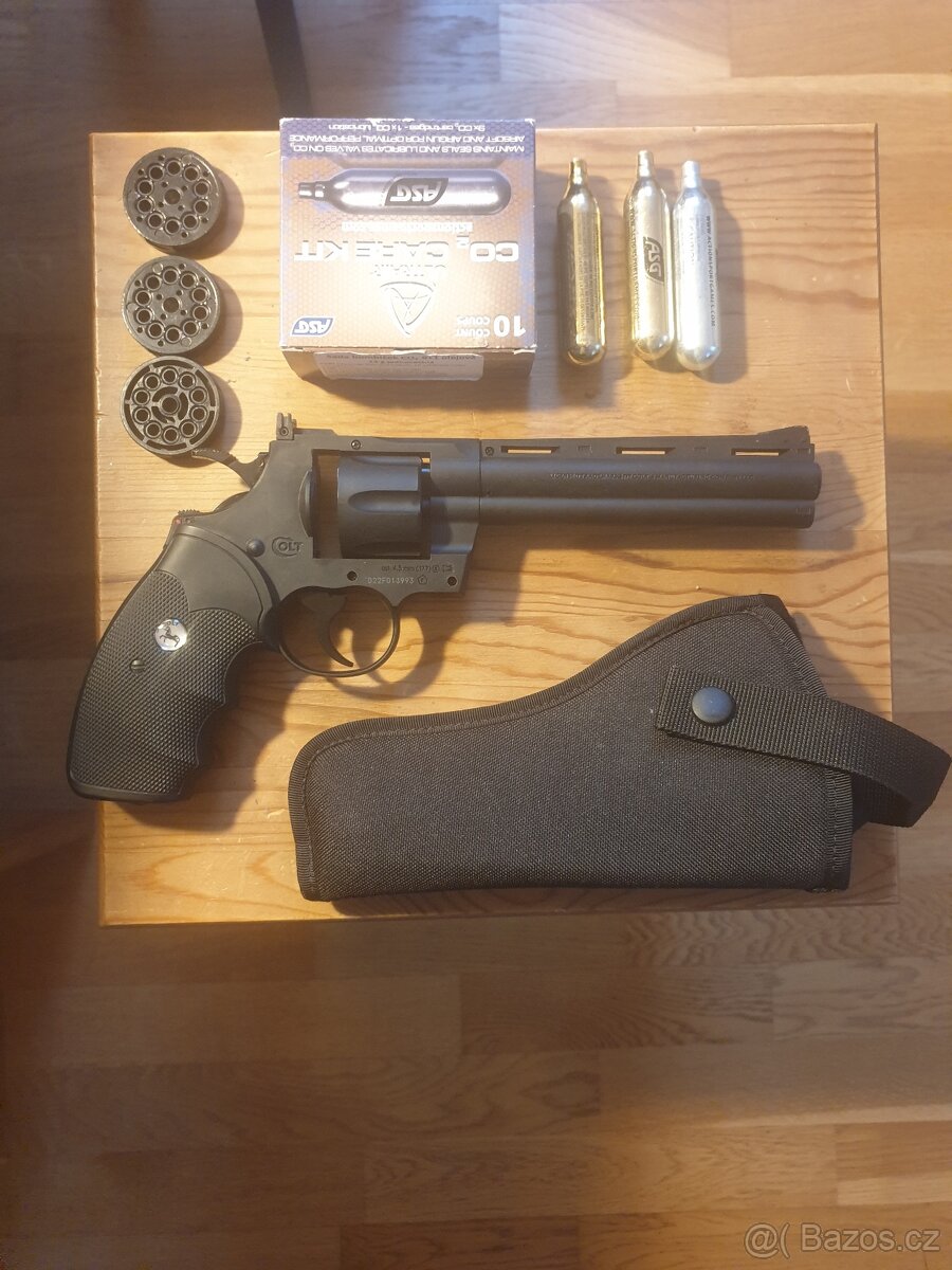 Krásný dárek. Prodám ve stavu nového vzduchový CO2 revolver UMAREX Colt Python 6 4,5 mm Diabolo/BB. Je zcela bez jakéhokoliv poškození. Součástí jsou 3 zásobníky plus pouzdro na nošení a úschovu. Byl zakoupen pro syna a vystříleli jsme 1 sadu bombiček. Syn, ale pak přešel na klasickou dlouhou vzduchovku. Colt prodávám včetně krásného pouzdra, sady bombiček a 3 zásobníků. Pro mne velké překvapení jak je colt přesný a dobře se z něj střílí.