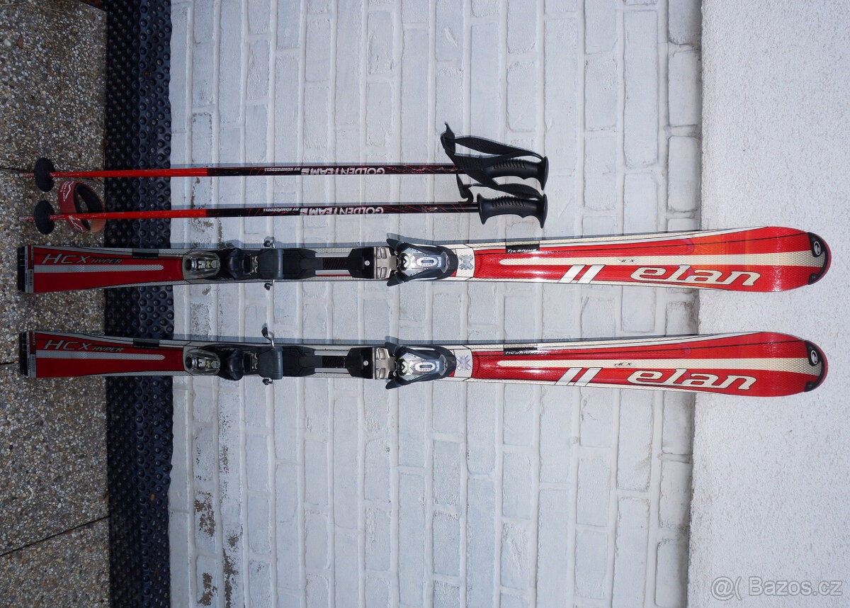 Skoro nové carvingové lyže 162 cm slalomky Elan, bezvadný stav, očividně velmi málo jeté, i skluznice v bezvadném stavu. Označení modelu: Elan Hyper HCX, rádius 11,5m, geometrie 116-83-106mm, sendvičová konstrukce Sidewall s výztuhou Double Titanium + vázání Elan E11.0 carvingové podložce XP + hůlky Golden Team.