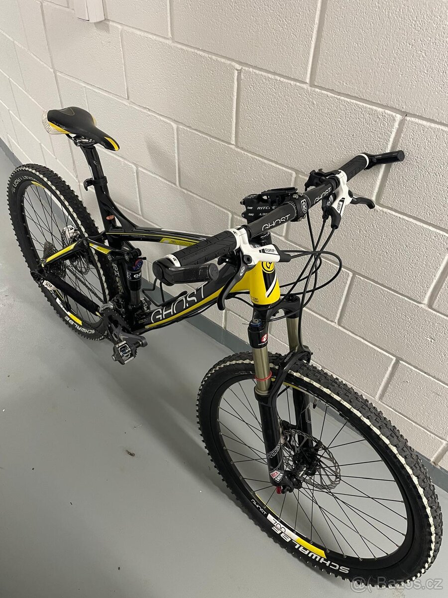 Celoodpružený karbonový rám. Váha okolo 10kg, rám velikost M-L (vhodné pro 175-185cm postavu). Kola velikosti 26 palců. Pravidelně servisované a bez závady.