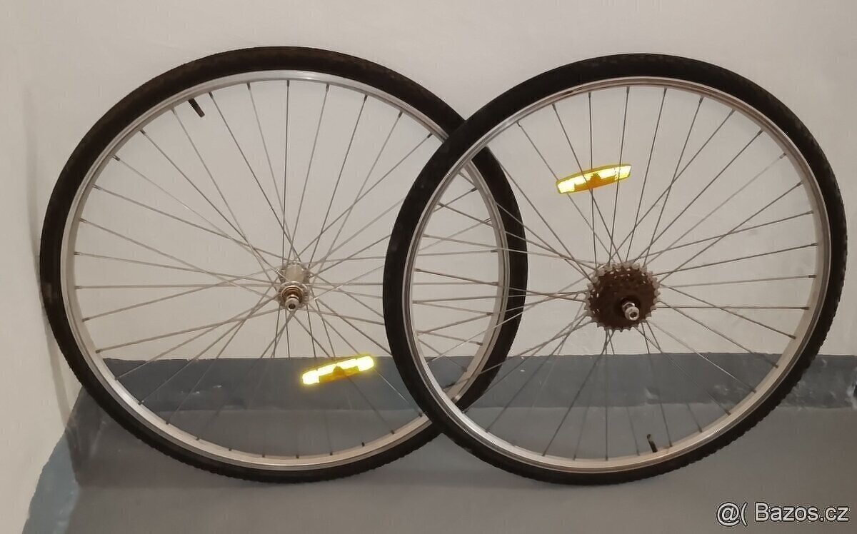 Prodám přední a zadní kola se silničními plášti. Nová ložiska, pláště, duše. Cena za obě,mohu poslat.