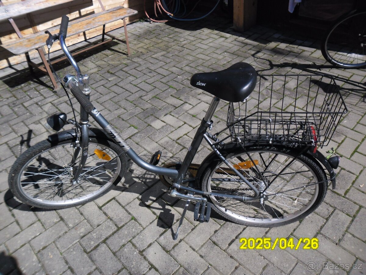 Prodám uvedené kolo v pěkném stavu, pohodlné nastupování, duralové ráfky, stojan, košík , světla. Chce seřídit.