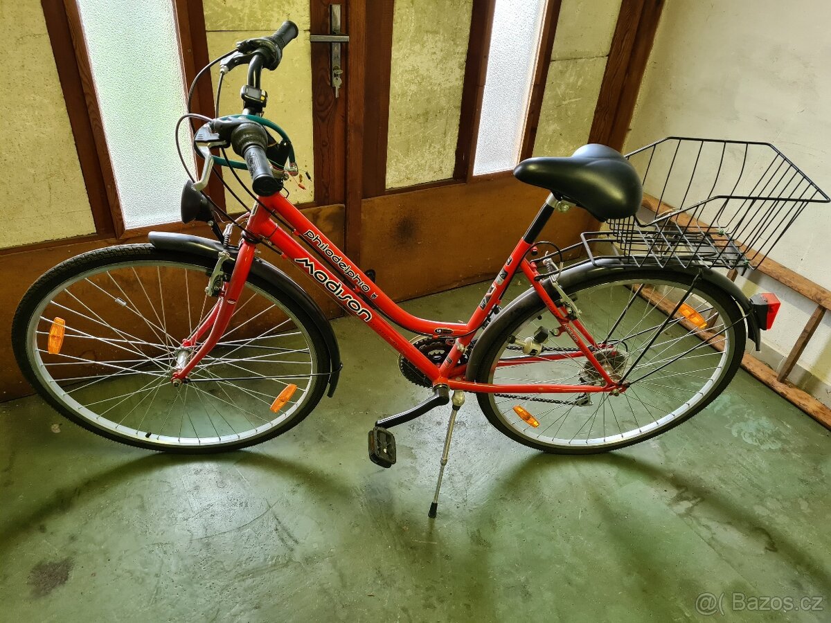 Prodám městské kolo značky Madison Philadelphia - červené barvy, 18 převodů, velmi dobrý stav, košík, stojánek, dynamo, tachometr, součástí kola, osobní odvoz.