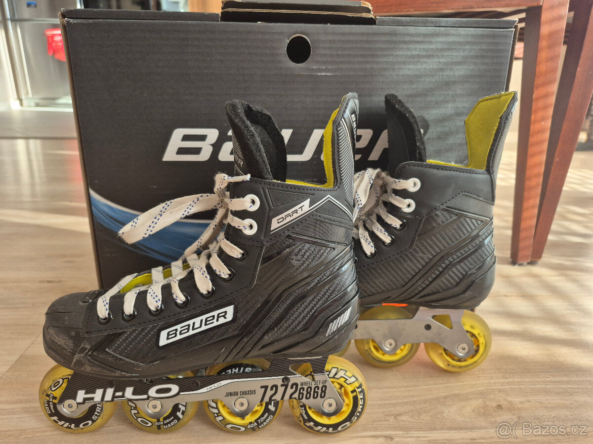 Inline brusle Bauer RH DART SKATE SR - [16.12. 2025]In-line brusle s komfortní, anatomicky tvarovanou botou. Určené na asfaltové povrchy / stezky. Kolečka s tvrdostí 82A o rozměrech 2x 80mm (vzadu) a 2x 76mm (vepředu). Hliníkové šasi HI - LO, ložiska HI -LO ABEC 5.