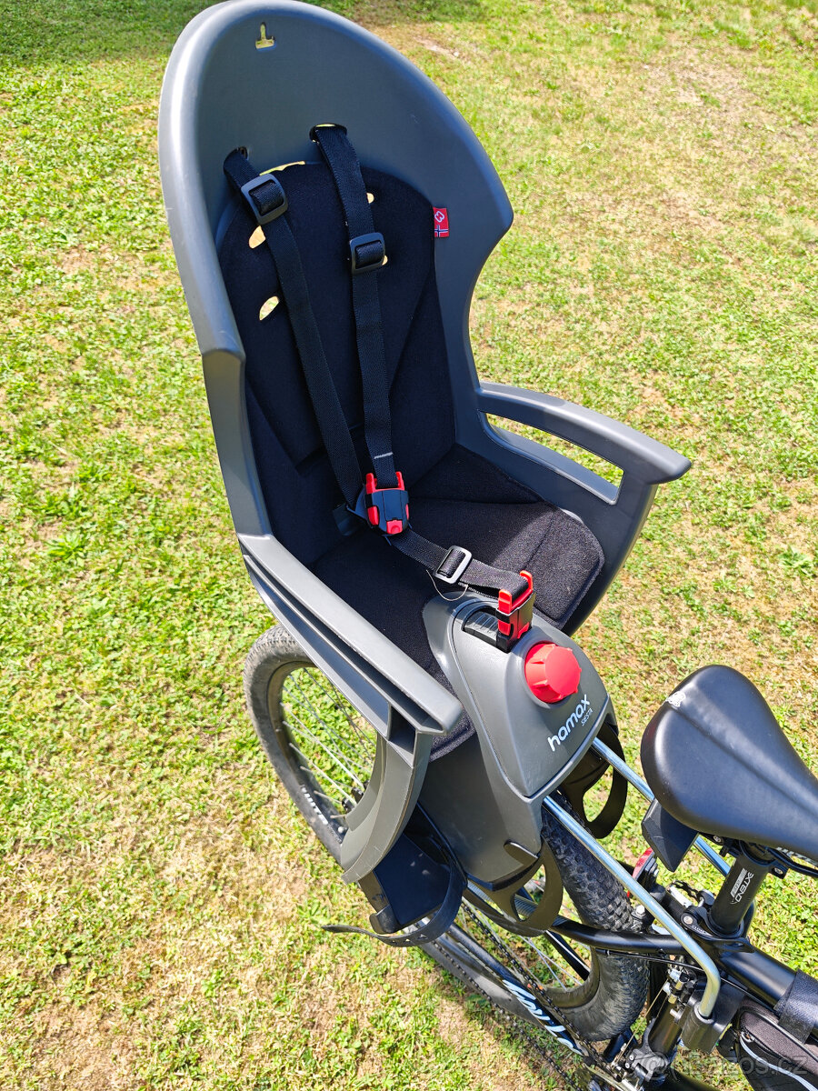Velmi zachovalá zadní samonosná dětská sedačka s černým polstrováním se uchycuje za sedlo a není potřeba použití zadního nosiče. Taktéž umožňuje uzamknout nosné tyče, které pak nelze vyjmout. Sedačka je vhodná pro děti od 9 měsíců a maximální hmotnost dítěte je 22 kg. Velkou výhodou jsou stavitelné opěrky nohou, které jsou navíc kryté a chrání tak nožičky před výpletem kola. Vyšší bezpečnost zajišťují inovované popruhy. Nechybí ani možnost sklopení sedačky až o 20°. Opěradlo disponuje prolisem, tak aby nevadilo v pohybu hlavou i s nasazenou helmou.