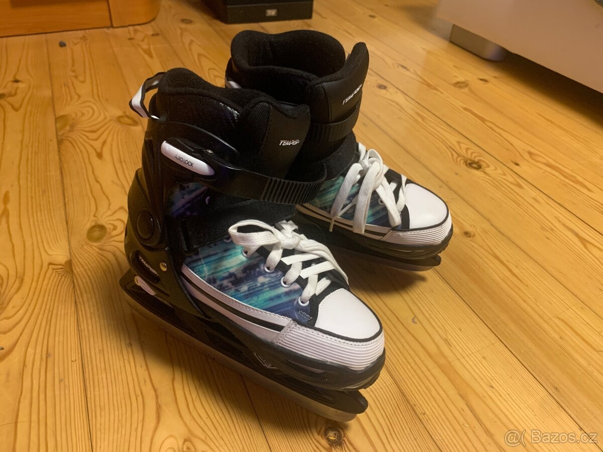Dětské nastavitelné brusle vel. 30–33 - [1.1. 2026]Prodám dětské nastavitelné brusle vel. 30–33, včetně vložek. Plně funkční, jen občas povoloval horní pásek.