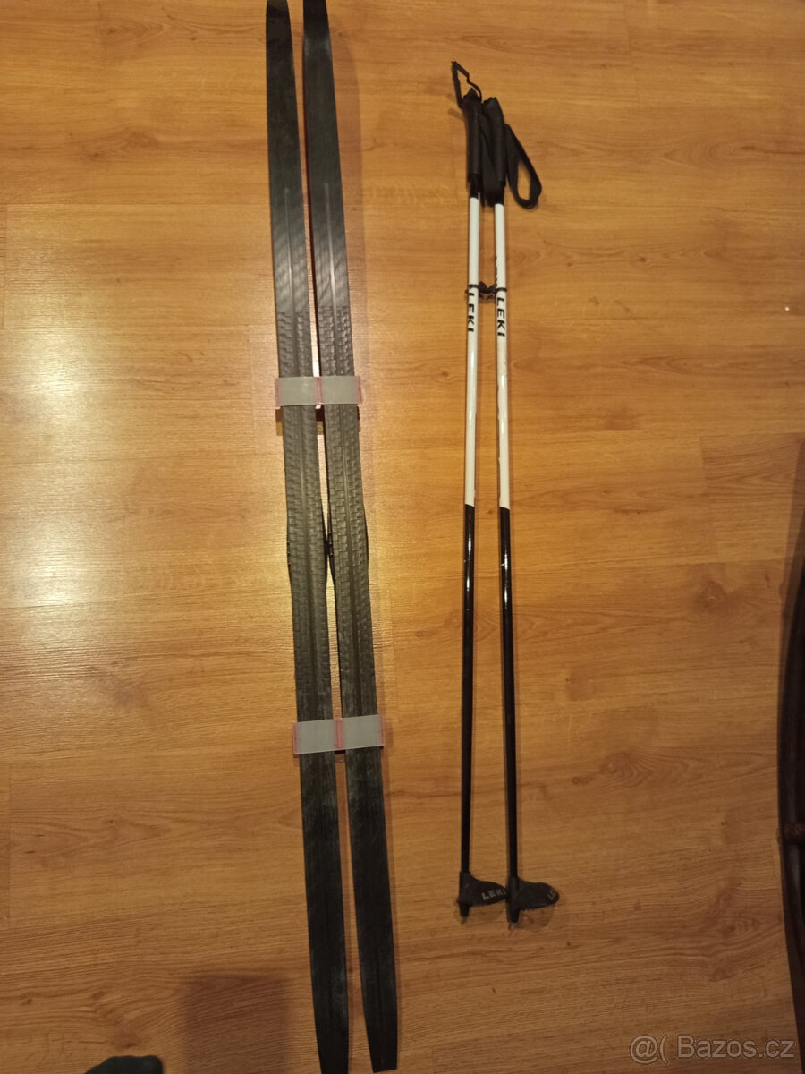 Prodám dětské běžky Peltonen(148cm), vázání Rottefela + hůlky(120cm)