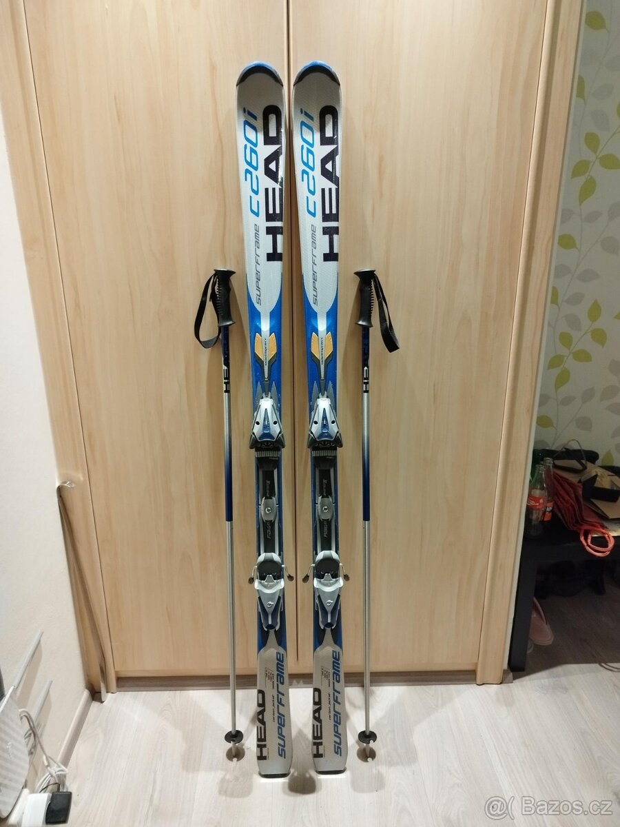 Sjezdové carvingové lyže HEAD v délce 170 cm, radius 14.7 m + Vázání Tyrolia SuperLite SL10 + Hůlky HEAD 125 cm.