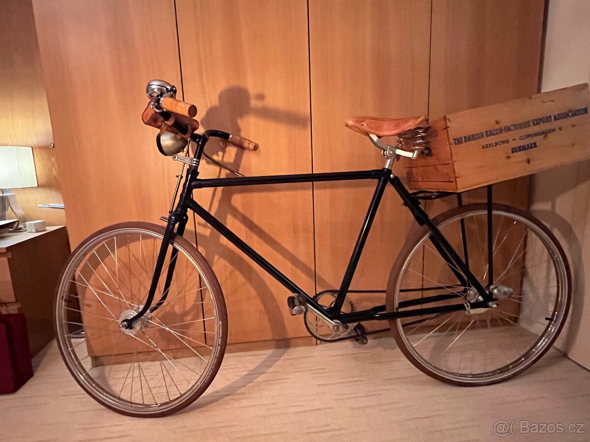 Prodam tohoto retro fesaka, pánské staré velice stylové jizdni kolo, puvodni ram odlehčený krasnymi doplňky, krasny stav, slouzilo vicemene jako dekorace v interiéru, ale je plně funkční obcas vyjelo na spanilou jízdu, novy komaxitovy odolny lak, nova kola vcetne plášťů v krasné koňakové barvě, drevene rukojeti, nova avsak puvodni sedacka, krasny kousek! Kovove dily v zinkochromátu. K videni v Roudnici nad Labem.