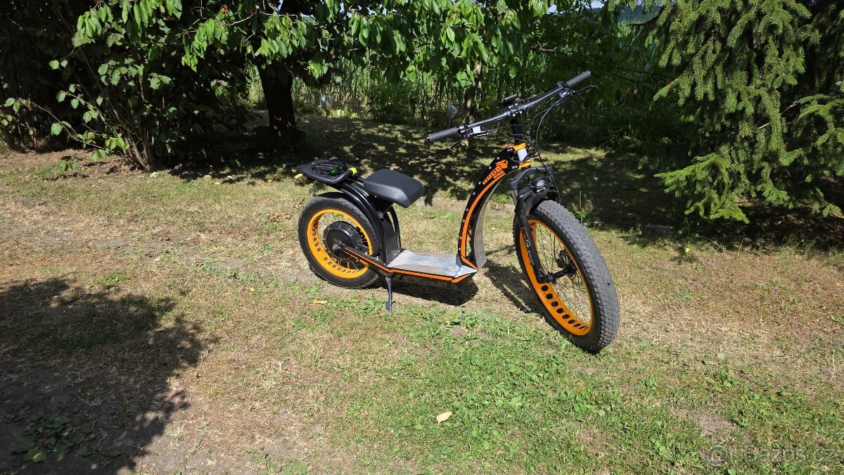 E-KOLOBĚŽKA PRO NÁROČNÉ, KTERÁ JE OSAZENA 3 kW MOTOREM. VELICE DOBŘE OBSTOJÍ I VE STŘEDNĚ TĚŽKÉM TERÉNU.