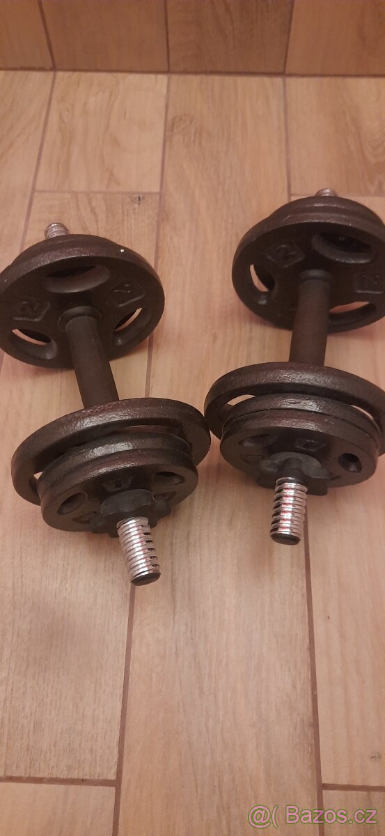 Prodám činky jednoručky 2× 10kg.S kotouči 4x 2kg a 8x 1kg. Libovolně stavitelné.