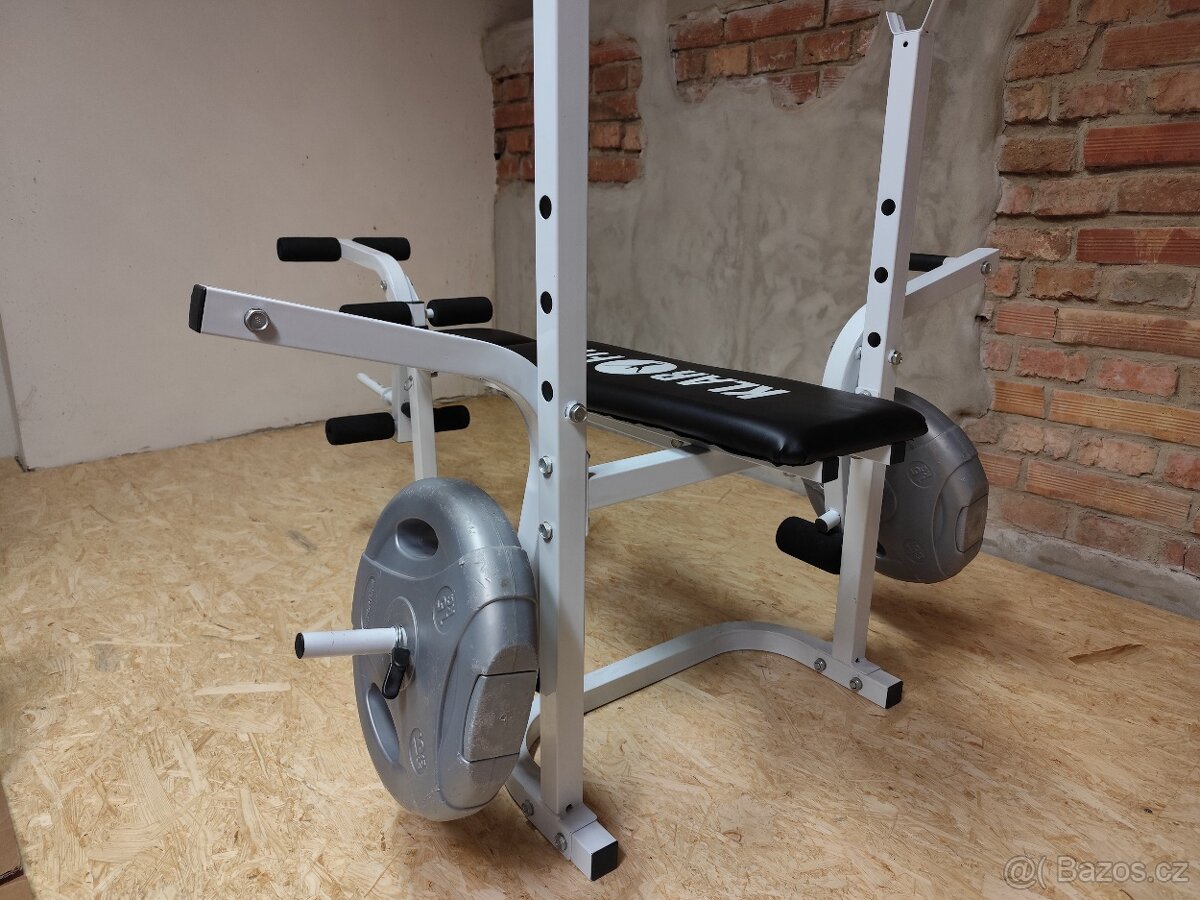 Posilovací lavice je jako nová. Spíš bych jí doporučil někomu kdo se cvičením začíná. K lavici dám ještě dvě patnáctikilové závaží.