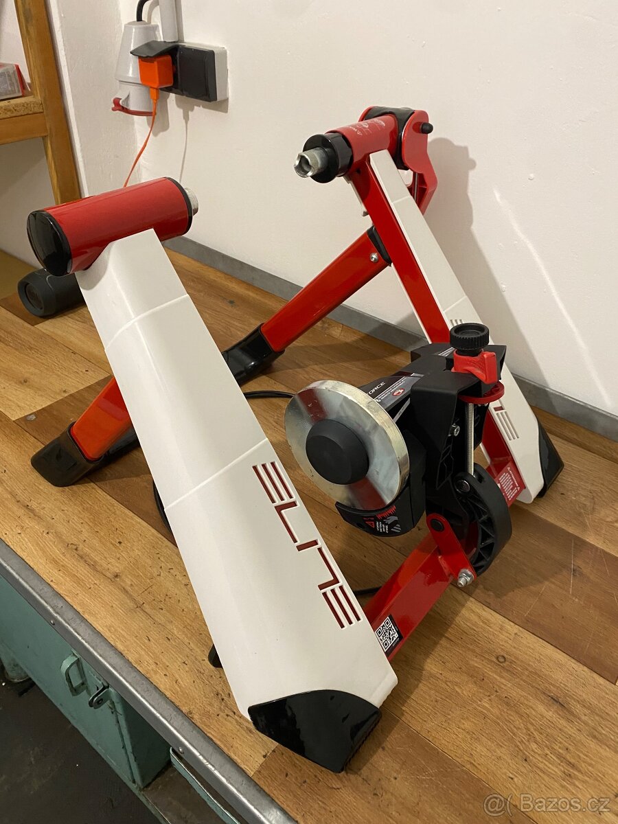 Cyklotrenažer Elite - [9.2. 2026]Málo jetý, tichý chod, snadné upnutí kola. Odpor zajišťuje kapalina, řadí se normálně jako za jízdy na silnici. Automatický přítlak dle hmotnosti jezdce. Podložka pod přední kolo v ceně.