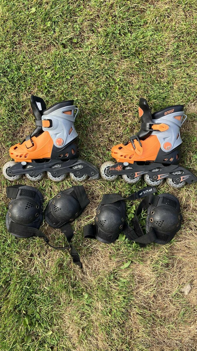 Prodám dětské kolečkové brusle. Velikost je nastavitelná 28-32. Někomu ještě jistě poslouží. K bruslím přidám chrániče kolen a loktů.