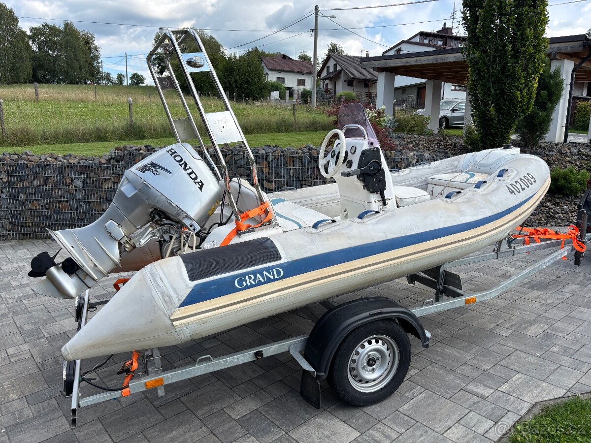 Prodám nafukovací motorový člun s pevným kýlem, délka 3,8m zaregistrováno na SPS Přerov, platná technická prohlídka, motor Honda 50 koní, elektrický start, elektrické naklápění motoru, palivová nádrž 25l, přívěsný vozík s STK 2029