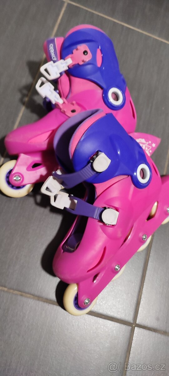 Prodám použité dívčí kolečkové brusle, nastavitelná velikost 32-34. Známky používání viz foto.