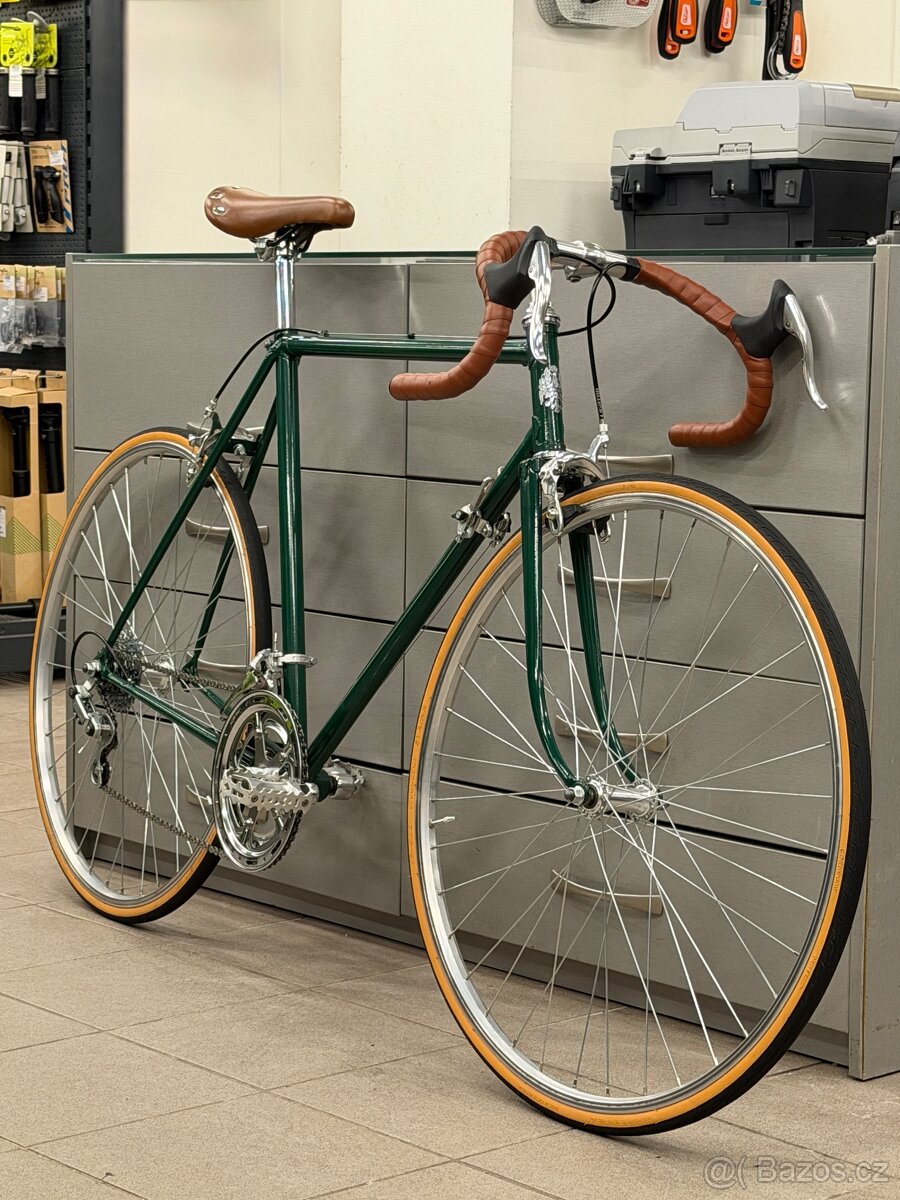 Prodám vintage silničku postavenou na rámu Favorit speciál z roku 1988. Rám byl opískován a nastříkán práškovou barvou v odstínu british racing green. Rám je osazen zcela novými komponenty. Od sedlové trubky, přes převody až po hlavové složení a řídítka vše nové. Přehazovačka, přesmykač, řazení a vícekolečko Sunrace, vše nové. Kola Remerx, obyčejný jednostěnný ráfek, pláště Rubena 700x25c s béžovým bokem, vše nové. Kolo má najeto max. 50 km. Používal jsem ho na občasné popojíždění po městě. Stylová silnička se super vzhledem, díky převodům lepší než singlespeed, a nebo vhodné jako dekorace do interiéru prodejny či kavárny.