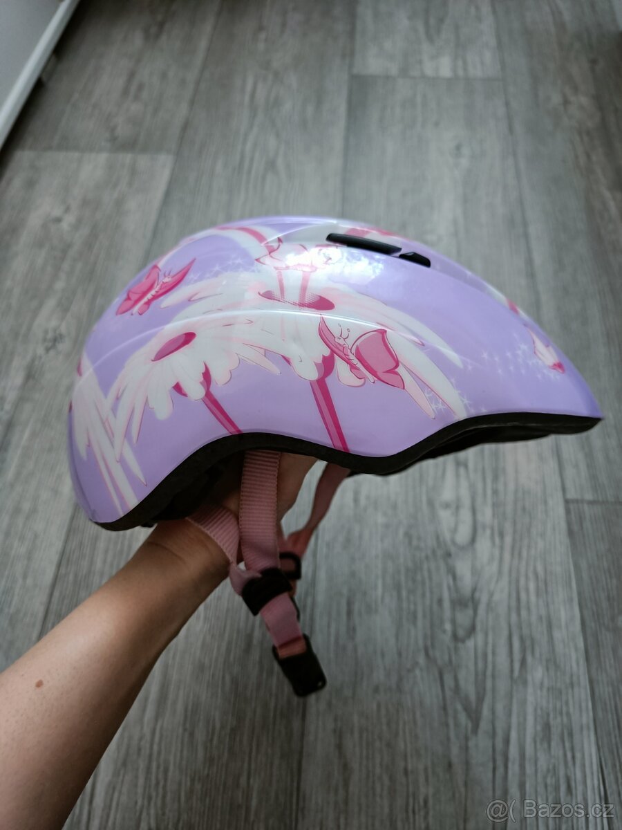 Značka Uvex. Velikost 46-52. Nebouraná, jen má malou promáčklinu - nepatrná, škrábanečky. Regulace obvodu hlavy, řemínek nastavitelný.