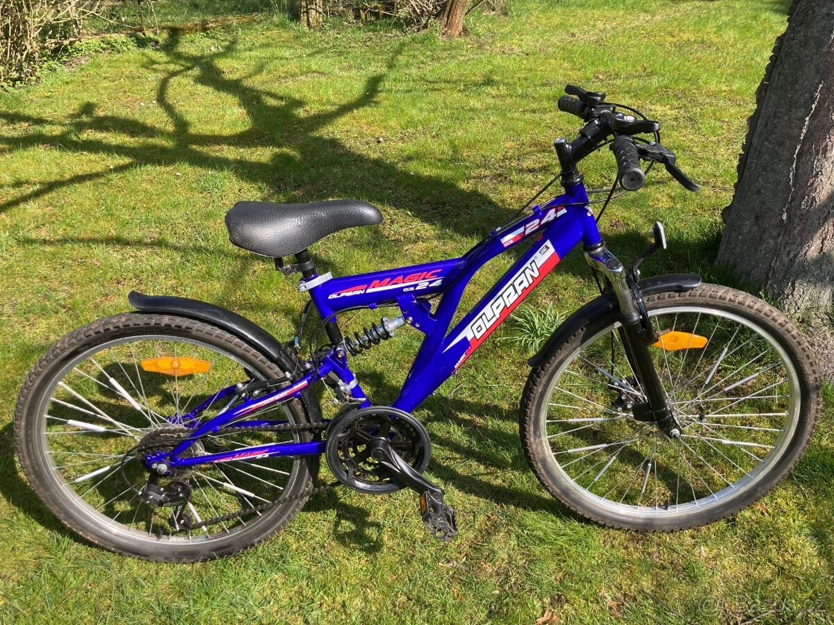 Prodám juniorské horské kolo Olpran Magic Disc 24. Odpružené přední vidlice a rám. Na předku kotoučová brzda. Výbava Shimano. Vhodné pro děti 8-11 let. Kolo je jako nové. Drobná vada-ulomený zobáček páky přední brzdy-na funkci nemá vliv.