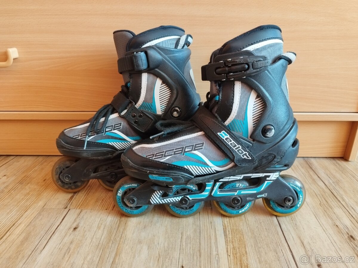Nabízím klasické kolečkové brusle-stažení tkaničkou, fixování suchým zipem a utažení páskou podle potřeby.Velká výhoda je nastavitelnost velikosti od 35 do 38 -odpovídá.