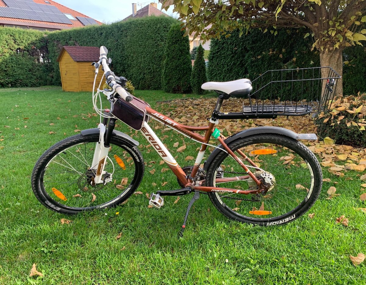 Prodám kolo Merida Juliet s kotoučovými brzdami a přehazovačkou Shimano, velikost 18 palců. Součástí kola je také vybavení zobrazené na fotce: košík na zadním nosiči a cyklotaška na rámu. Kolo má běžné známky používání, jinak je bez závad.