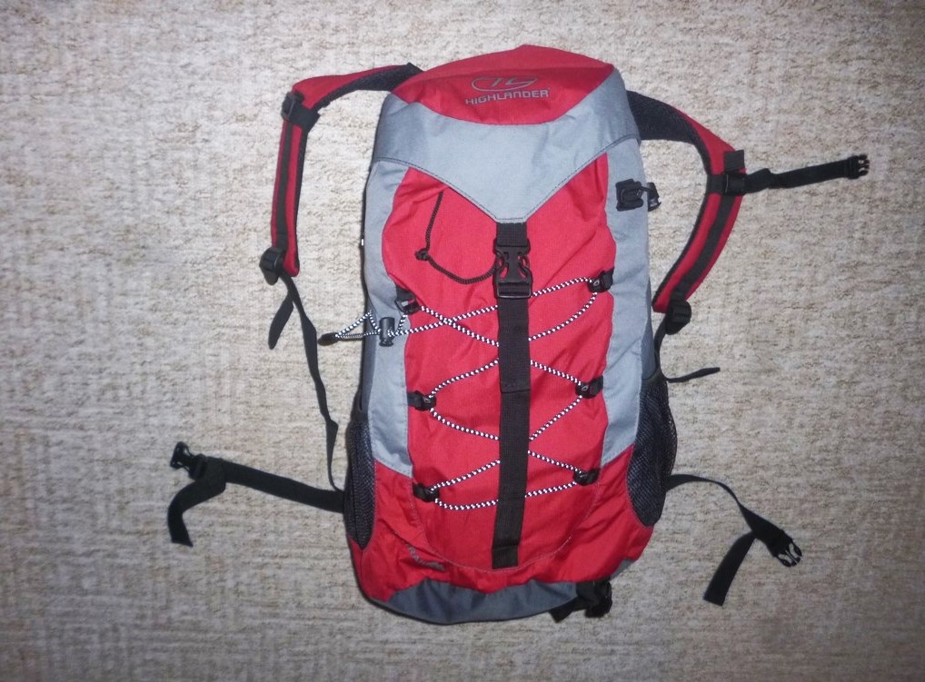 HIGHLANDER 45 na turistiku. Odvětraná záda , polstr.štelov.popruhy , hrudní + beder.pás , H2O , kapsy 2 postr.na zip + 2 síť. ,1 horní , upínací řemeny.100% STAV.PC - 2000Kč