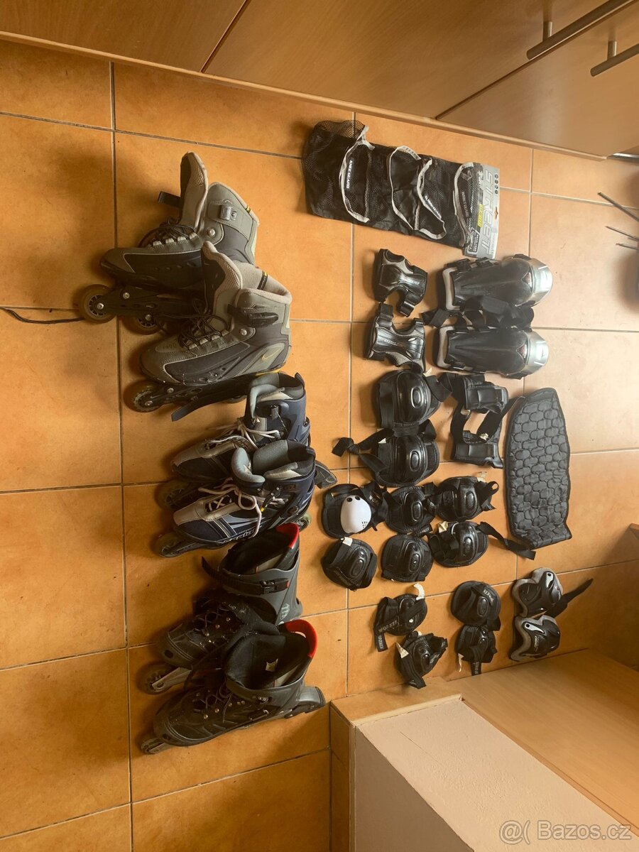 Prodám 3 ks kolečkových bruslí a chráničů ve velikostech 42, 41 a 42. K tomu sada chráničů.