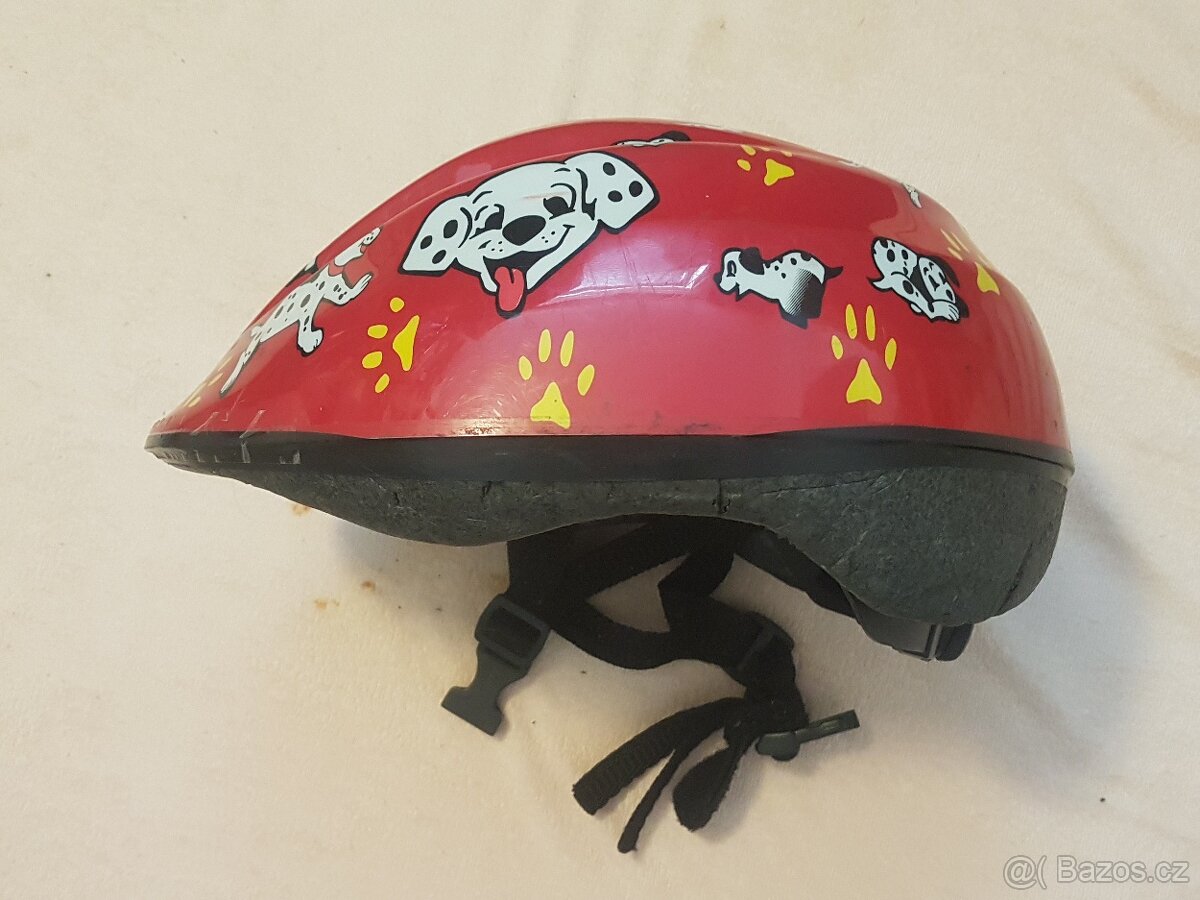 Prodám cyklistickou červenou dětskou helmu s obrázky pejsků, obvod hlavy 46-56 cm.