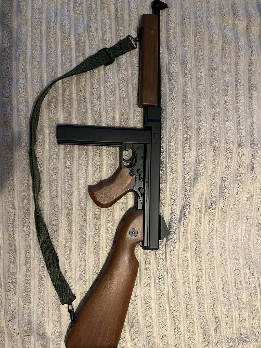 Dobrý den, prodám tuto zbraň z důvodu toho že jsem ji nikdy pořádně nevyužil a je mi líto ji nechávat ležet aby se na ni jen prášilo. Byla zakoupena na e-shopu AirsoftPro a byla použita pouze jednou, je tedy zcela bez závad. Jedná se o repliku druhoválečné zbraně M1A1 Thompson (celokov+ napodobenina dřeva) módy střelby se daji přepínat, akumulátor nacházejici se v pažbě je jednoduše odnímatelný.
