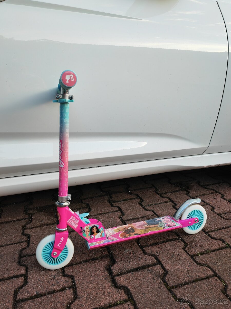 Koloběžka Barbie skládací, deska s protiskluzovou úpravou, velikost koleček 12cm, nastavitelná výška 3 varianty, skládací řidítka s měkkou rukojetí, s nášlapnou brzdou. Vyzvednutí Nádraží Jablonecké Paseky