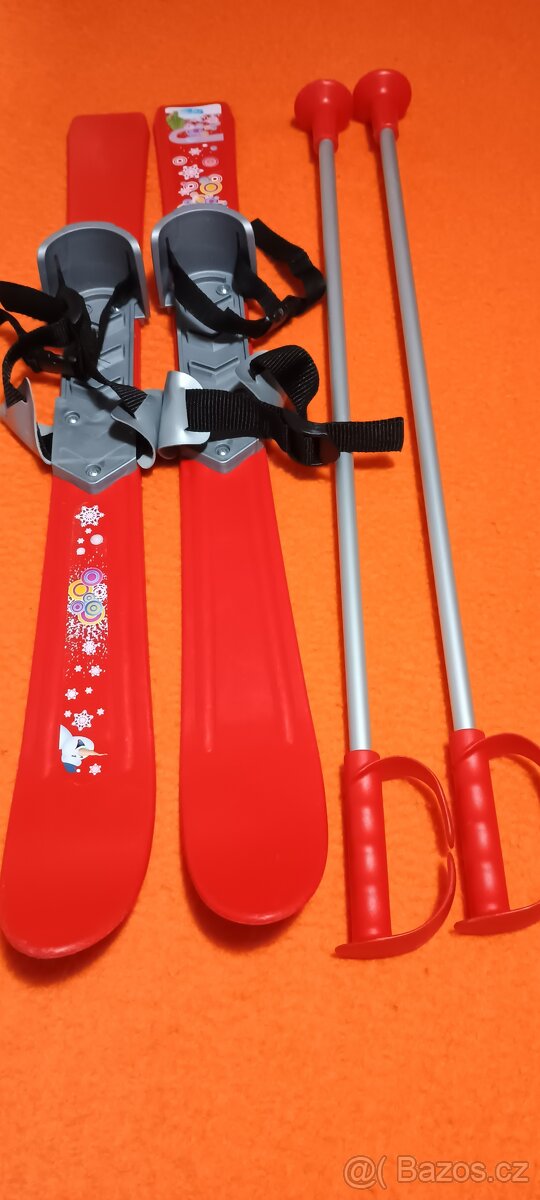 Prodám dětské lyžičky s jednoduchým vázáním na zimní boty a hůlkami, běžné opotřebení viz foto. Ideálně osobní předání.
