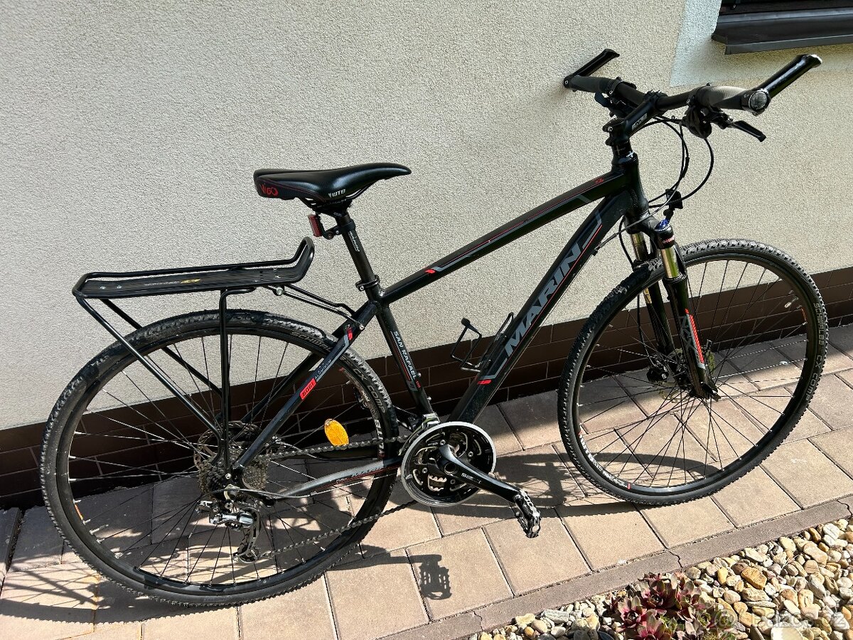 Prodám trekové kolo MARIN. Rám hliník, vybavení Shimano, kola 27,5", převody 2x9, pneu Schwalbe.kotoučové brzdy, odpružená vidlice.