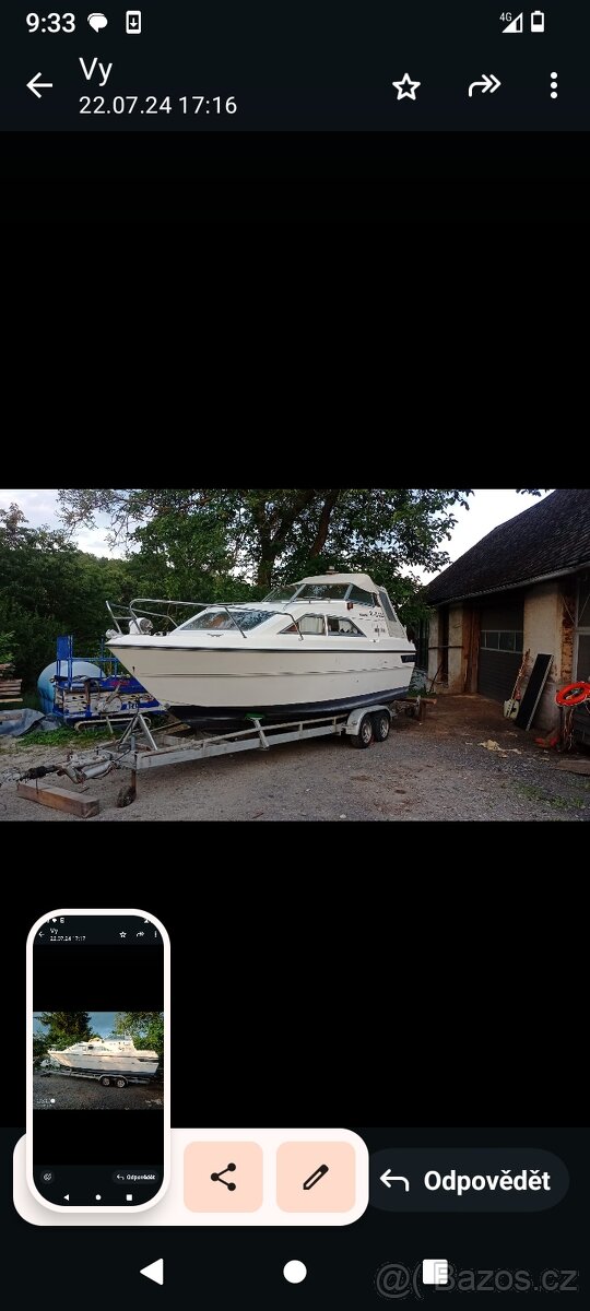 Prodám kajutový motorový člun s motorem mercruiser 5,7 i s vlekem na motoru je prasklá hlava od mrazu