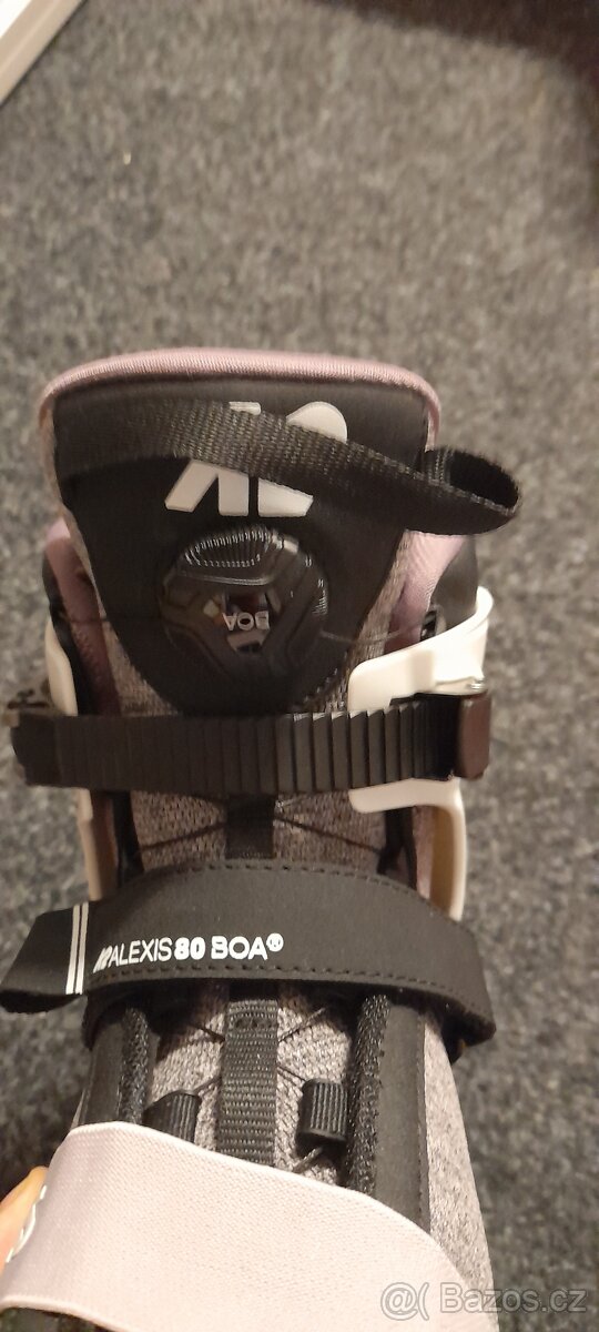In-line brusle K2 Alexis speed 84 mm (vel. EUR 40 / 26 cm) - [10.2. 2026]Nevhodný dárek, použity pouze několikrát. Velmi zachovalý stav bez většího opotřebení (viz. foto koleček a brzdy), čisté, bez poškození a škrábanců. Velikost EUR 40, délka stélky 26 cm. PC: 3990,-
