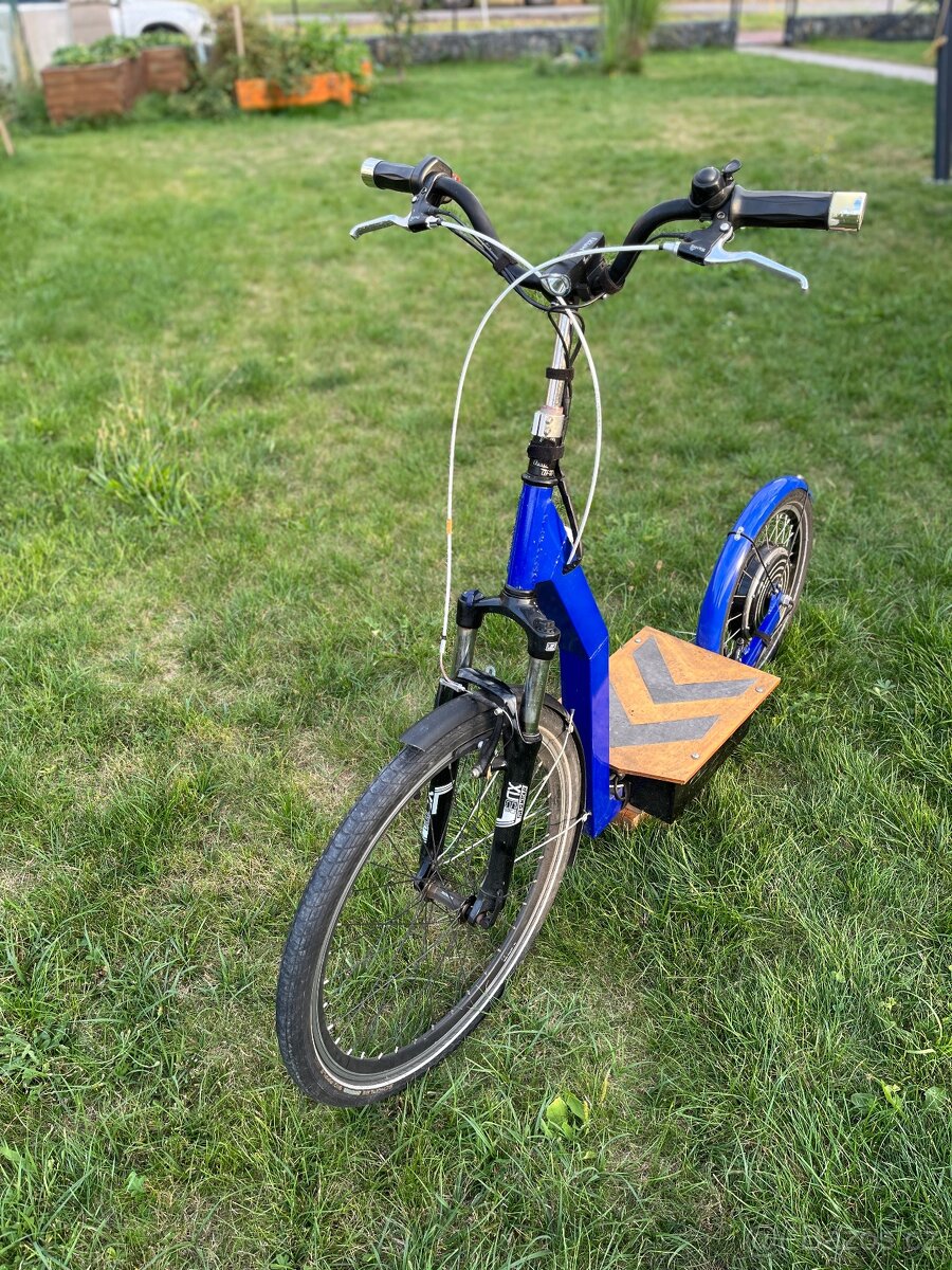 Prodam mnou stavenou Elektrokolobezku s pevnym ocelovym ramem, odpruzenou vydlici, kvalitnimi pneu Swalbe Big Apple - 26’ vpredu 20’, vzadu, motorem MagicPie 500-1000W a regulatorem Kelly s moznosti konfigurace z PC.