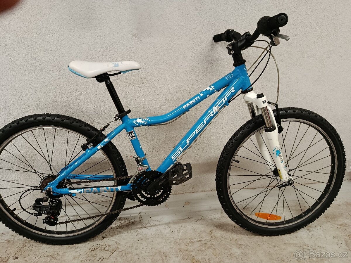 Dětské kolo Superior Paint velikost 24". Jedná se o kolo s velmi lehkým hliníkovým rámem, vhodné pro děti 120-150cm, převody Shimano 3x6. Odpružená vidlice. Nové oba pláště. Kolo je po servisu seřízené, promazané