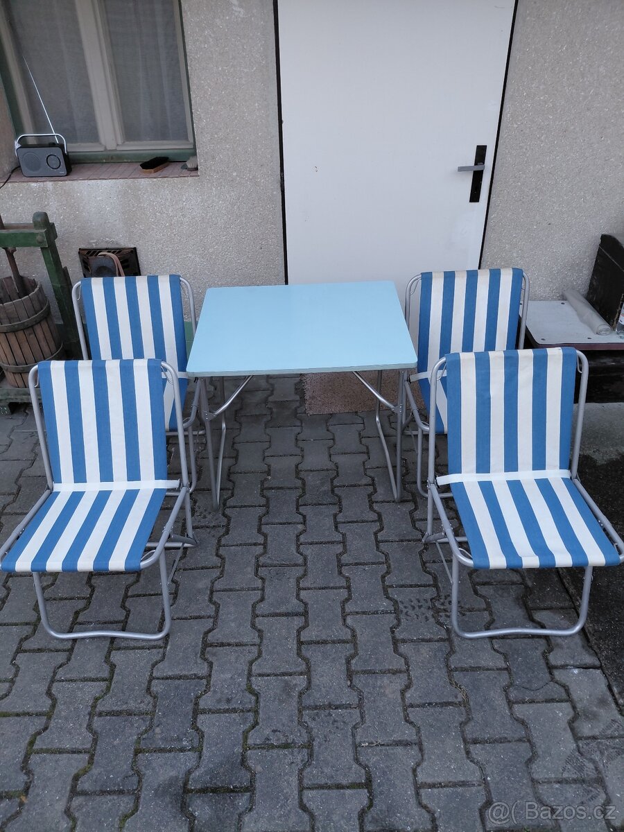 Prodám retro duralovou kempovací sadu stůl š70 x h60 x v63cm (deska stolu asi umakart) a čtyři židličky (potah není potrhaný ale vzhledem stáří pro požívání raději vyměnit).