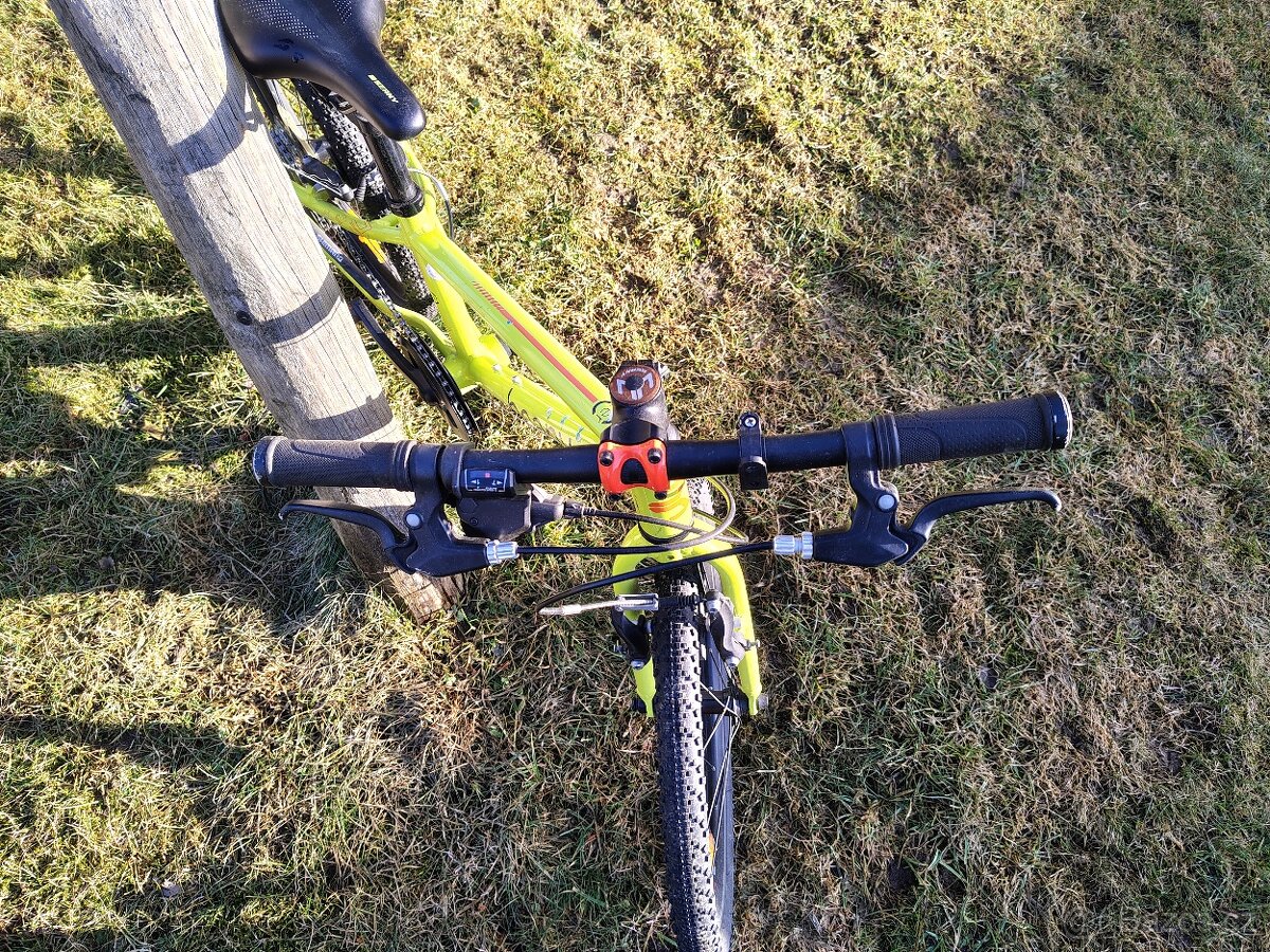 Pro děti cca od 110 cm 2x zeslabovaný hliníkový rám s vnitřním vedením lanek v rámové trubce. Kotoučové brzdy, řazení SRAM X5, přehazovačka SRAM X7/ 1x9 rychlostí. Odpružená vzduchová vidlice zamykate ...