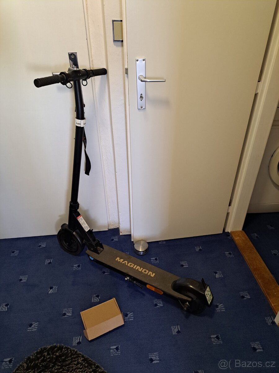 Prodám plně funkční elektrokoloběžku Maginon viz.foto. koloběžka je téměř nejetá (zánovní). Proběhla celková revize, vše plně funkční. Přidám úplně novou nabíječku. Max. rychlost 20 km/h. Tři polohy jízdy, také viz.foto. Osobní předání v Příbrami. Platí do smazání.