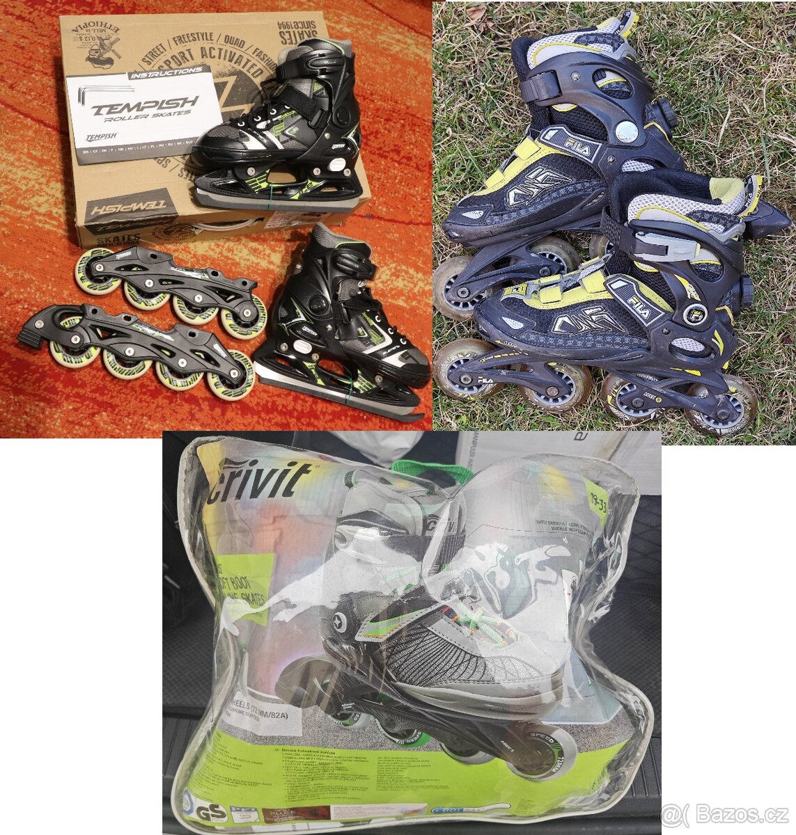 1, Rostoucí brusle Tempish Element Duo na led/kolečkové inline vel. 33-36. Zánovní, stav 95%, první majitel. Včetně návodu, 2xklíčů, chráničů na nože a originál krabice s praktickým plastovým poutkem/madlem na nošení. Kolečkové včetně zadní brzdy nebyly vůbec použité, nože na led jenom párkrát, jsou nabroušené. Cena 1500kč.