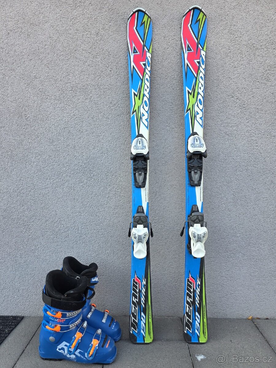 Prodám lyže NORDICA TEAM včetně vázání, délka 130 cm, lyže jsou pěkné, skluznice v pořádku, cena za lyže je 2500,- Kč. Nabízím i lyžáky LANGE, délka vnitřní stélky je 23,5 cm, celková délka boty je 275 mm, cena za boty je 1500,- Kč.