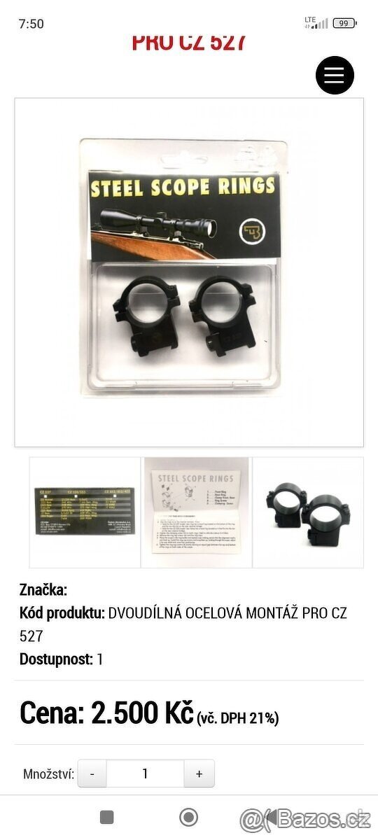 Prodám novou kvalitní ocelovou montáž na cz 527. Kroužky 25mm