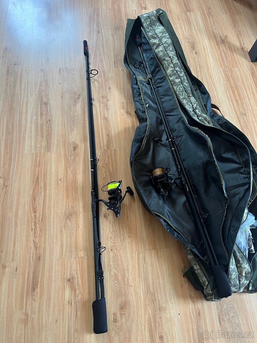 Prodám dva pruty s navyjáky a tašku. Již není čas a jen se to doma válí… pruty jsou dvoudílné o celkové délce 3,6m ve složeném stavu tedy cca 180cm. Narovinu jsou to spíše tužší pruty na větší ryby. Tahat na tom ryby pod 40cm nuda a clovek si to neužije což je taky důvod proč jdou z domu. Vzhledem k perfektnímu stavu bych si za celek představoval 8 000kč.