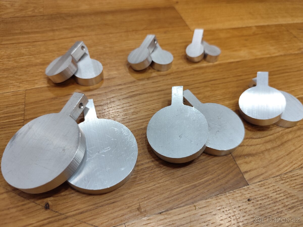 Prodám otočné terče pro střelbu nejen ze vzduchovek o průměrech 20mm (20kč/ks), 25mm (25kč/ks), 30mm (25kč/ks), 40mm (30kč/ks), 50mm (35kč/ks) a 60mm (45kč/ks). Dále také terče ve tvaru lebky s "mozkovnou" 50mm za 50kč/ks. Otvor pro osu 4.2mm, materiál hliník tloušťka 10mm. Snese i zásahy z 60J+ pcp, viz foto.
