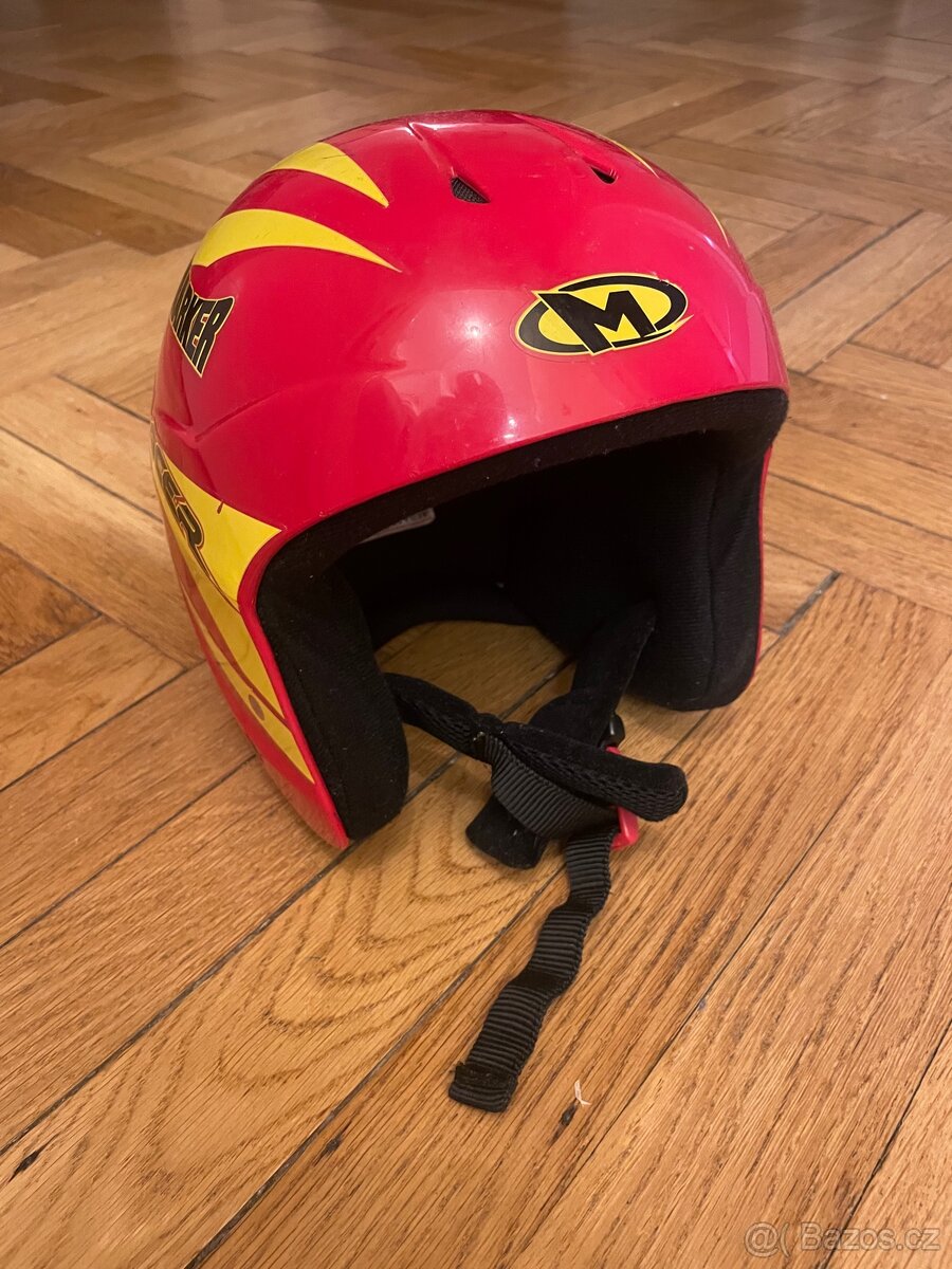 Vintage retro lyzarska helma Marker Tracer, vnitrek ve velmi dobrem stavu, zateplena, uzavrena skorepina z odolneho plastu, polstrovani pres usi, dobre sedi i bez dotahovaciho kolecka, velikost neni uvedena, cca 51 cm, pro deti 4-7 let