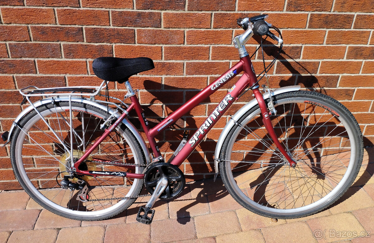 Prodám starší dámské trekové kolo Sprinter Genesis, hliníkový rám 18" s pevnou vidlicí, výbava Shimano s řazením Revo Shift, kola 27,5", nosič, měkký dodatečný potah na sedle, červená barva. Seřízené, ve velice pěkném stavu, připravené k okamžitému provozu. Cena 1500 Kč.
