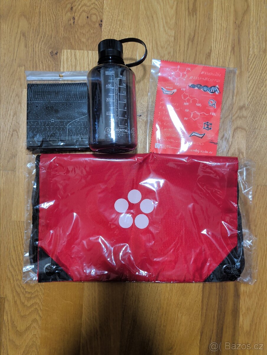 Prodávám různý merch z VŠCHT, PřF České Budějovice a Univerzity Pardubice. Vše za 200 (tedy věci na první i druhé fotce celkem za 200). Vak na boty, plastová láhev, 2 microfiber útěrky a 2 šátky.