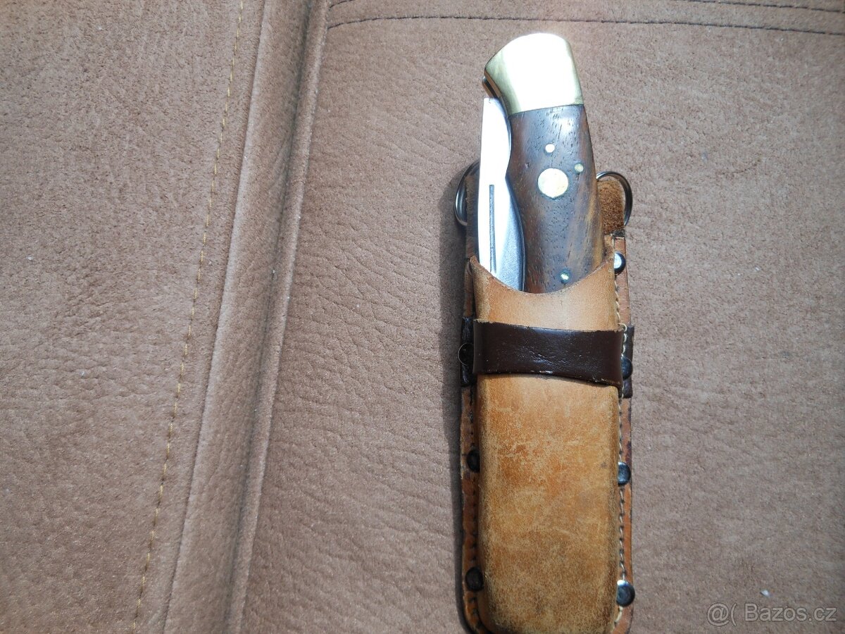 kapesni nuž dřevo+ mosaz delka složeny 11 cm. + kož. pouzdro cena 600,-
